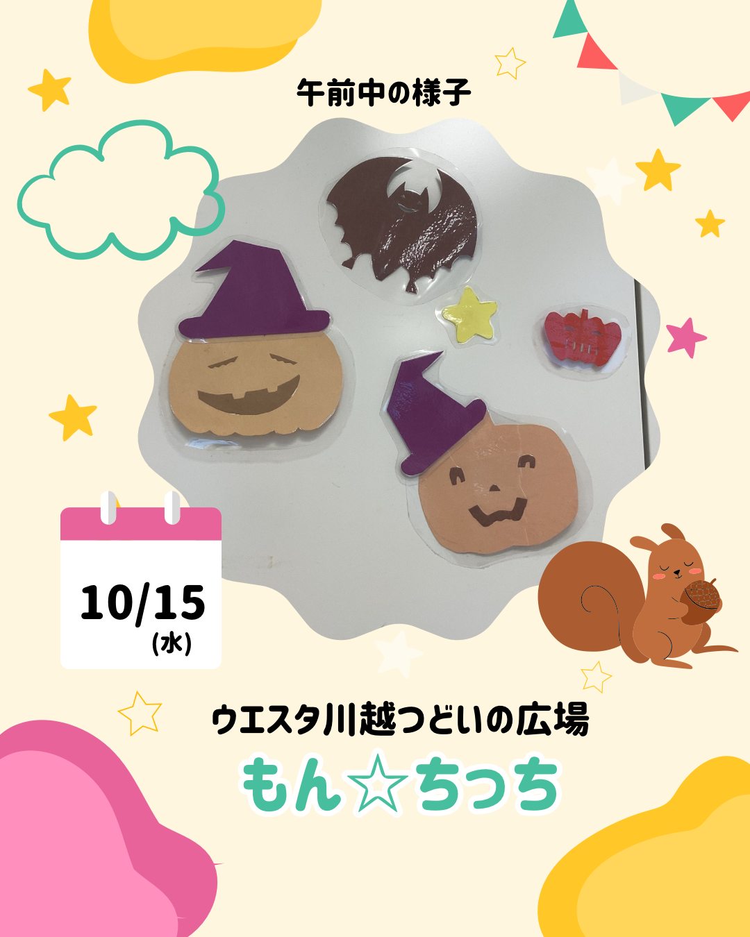 10/15(水) 午前中の様子 2025 10/15 今日の様子 2025年10月15日 曇り空ですね…。 お散歩がてら遊びに来てね♫待っているよ♫ (まいちゃん、かずみちゃん、なっちゃん) 今日の様子 この記事が気に入ったら フォローしてね! Follow @monchi_hiroba Follow Me よかったらシェアしてね! URLをコピーしました! 10/9(木)午前中の様子 10/20午前の様子 この記事を書いた人 nw_monchi ウェスタ川越つどいの広場(愛称:もん☆ちっち)はNPO法人川越子育てネットワークが受託し、運営しています。気が向いたときに、子どもと一緒にふらっと遊びにいきたくなる場所。子育て経験のあるママ&パパスタッフが、みなさんをお待ちしています。 関連記事 2/2(月)午前中の様子 2026年2月2日 1/27(火) 午後 お誕生会 2026年1月27日 1/27(火)1月お誕生日会午前中 2026年1月27日 1/22(木)ハーバリウム(植物標本)制作講座を開催しました。 2026年1月22日 1/20わらべうた講座のようす 2026年1月20日 1/14午後の様子です 2026年1月14日 1/8(木)今日のもんちっち 2026年1月8日 12/24(水)午後の様子 2025年12月24日 カテゴリー お知らせ その他 予約状況 今日の様子 講座・イベント