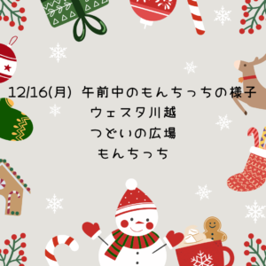 12/16(月)午前中のもんちっちの様子 2024 12/16 今日の様子 2024年12月16日 今日はゆるりと過ごしましたよ。 午後も楽しく遊びましょう。 暖かくして来てね^_^ (まい・かずみ・えこはん) 今日の様子 この記事が気に入ったら フォローしてね! Follow @monchi_hiroba Follow Me よかったらシェアしてね! URLをコピーしました! 12/13 金曜日 午後のクリスマス会🎄 12/18(水)午前の様子 この記事を書いた人 nw_monchi ウェスタ川越つどいの広場(愛称:もん☆ちっち)はNPO法人川越子育てネットワークが受託し、運営しています。気が向いたときに、子どもと一緒にふらっと遊びにいきたくなる場所。子育て経験のあるママ&パパスタッフが、みなさんをお待ちしています。 関連記事 2/2(月)午前中の様子 2026年2月2日 1/27(火) 午後 お誕生会 2026年1月27日 1/27(火)1月お誕生日会午前中 2026年1月27日 1/22(木)ハーバリウム(植物標本)制作講座を開催しました。 2026年1月22日 1/20わらべうた講座のようす 2026年1月20日 1/14午後の様子です 2026年1月14日 1/8(木)今日のもんちっち 2026年1月8日 12/24(水)午後の様子 2025年12月24日 カテゴリー お知らせ その他 予約状況 今日の様子 講座・イベント