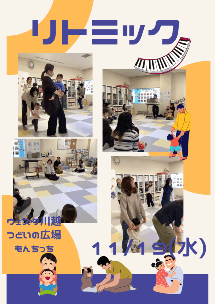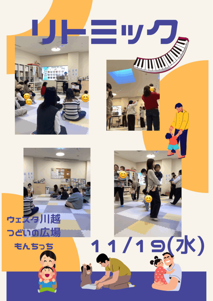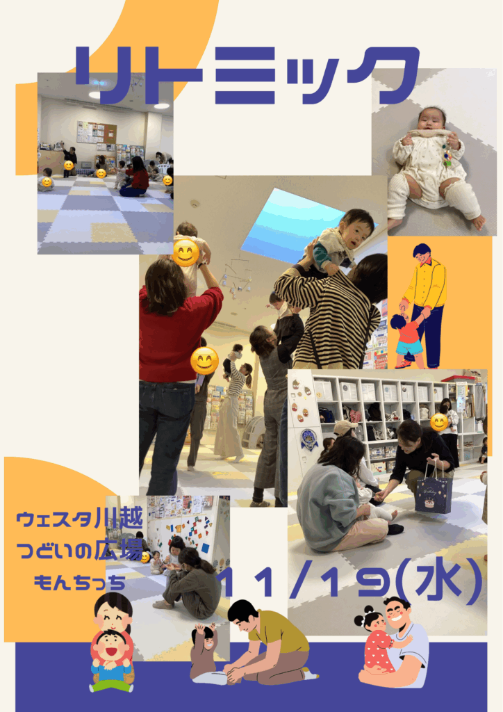 11/19(水)リトミック講座 2025 11/19 今日の様子 講座・イベント 2025年11月19日 今日の午前中はリトミック講座でした。 お返事したり、おにぎり作ったり、ピクニックからの動物園。 ママとたくさん触れ合って、どの子も み〜んなニッコニコ!(あやの、たき、かずみ) 今日の様子 講座・イベント この記事が気に入ったら フォローしてね! Follow @monchi_hiroba Follow Me よかったらシェアしてね! URLをコピーしました! 11/12(水)今日のもんちっち 11/25(火)11月のお誕生日会 この記事を書いた人 nw_monchi ウェスタ川越つどいの広場(愛称:もん☆ちっち)はNPO法人川越子育てネットワークが受託し、運営しています。気が向いたときに、子どもと一緒にふらっと遊びにいきたくなる場所。子育て経験のあるママ&パパスタッフが、みなさんをお待ちしています。 関連記事 2/2(月)午前中の様子 2026年2月2日 1/27(火) 午後 お誕生会 2026年1月27日 1/27(火)1月お誕生日会午前中 2026年1月27日 1/22(木)ハーバリウム(植物標本)制作講座を開催しました。 2026年1月22日 1/20わらべうた講座のようす 2026年1月20日 1/14午後の様子です 2026年1月14日 1/8(木)今日のもんちっち 2026年1月8日 12/24(水)午後の様子 2025年12月24日 カテゴリー お知らせ その他 予約状況 今日の様子 講座・イベント