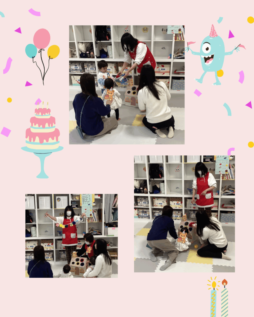 11/25(火)11月お誕生日会午後 2025 11/25 今日の様子 講座・イベント 2025年11月25日 お誕生日おめでとう🎂また遊びに来てね♫ 今日の様子 講座・イベント この記事が気に入ったら フォローしてね! Follow @monchi_hiroba Follow Me よかったらシェアしてね! URLをコピーしました! 11/25(火)11月のお誕生日会 12/3 今日の様子 この記事を書いた人 nw_monchi ウェスタ川越つどいの広場(愛称:もん☆ちっち)はNPO法人川越子育てネットワークが受託し、運営しています。気が向いたときに、子どもと一緒にふらっと遊びにいきたくなる場所。子育て経験のあるママ&パパスタッフが、みなさんをお待ちしています。 関連記事 2/2(月)午前中の様子 2026年2月2日 1/27(火) 午後 お誕生会 2026年1月27日 1/27(火)1月お誕生日会午前中 2026年1月27日 1/22(木)ハーバリウム(植物標本)制作講座を開催しました。 2026年1月22日 1/20わらべうた講座のようす 2026年1月20日 1/14午後の様子です 2026年1月14日 1/8(木)今日のもんちっち 2026年1月8日 12/24(水)午後の様子 2025年12月24日 カテゴリー お知らせ その他 予約状況 今日の様子 講座・イベント