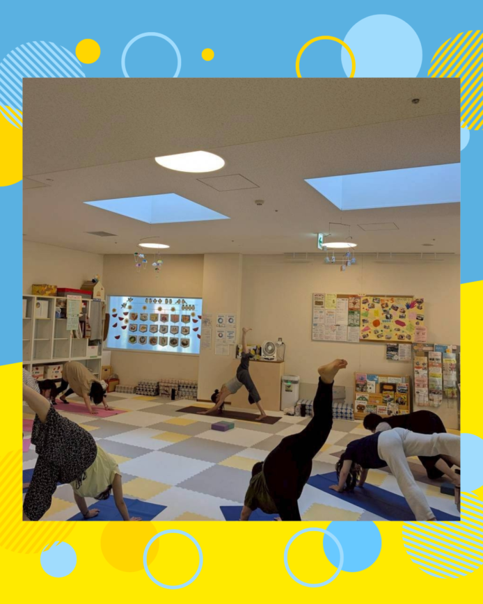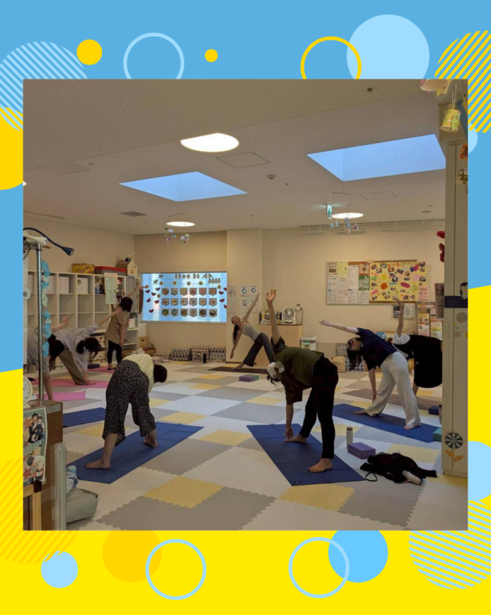 ママはつどいの広場で、体に無理のないようにゆっくり動かして、家でもできるヨガを先生に教えてもらいました。