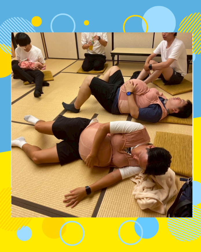 パパたちは別部屋でパパ同士の交流、妊婦エプロンをつけて、歩くとき・起き上がるときはどうなのかを体験しました。また、産後のママがどのような状態なのかをDVDで見てもらいました。