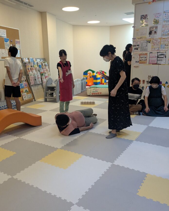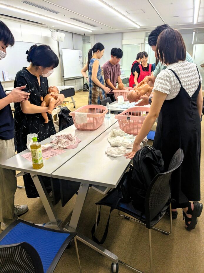 赤ちゃん人形を前にして緊張気味の参加者さんたちでしたが、「これでいいのかな…?」実際にやってみて自分の疑問が解消されると、だんだん笑顔が見えてきます。初めましてで近くに座った人同士で、楽しそうに交流している様子もありました。