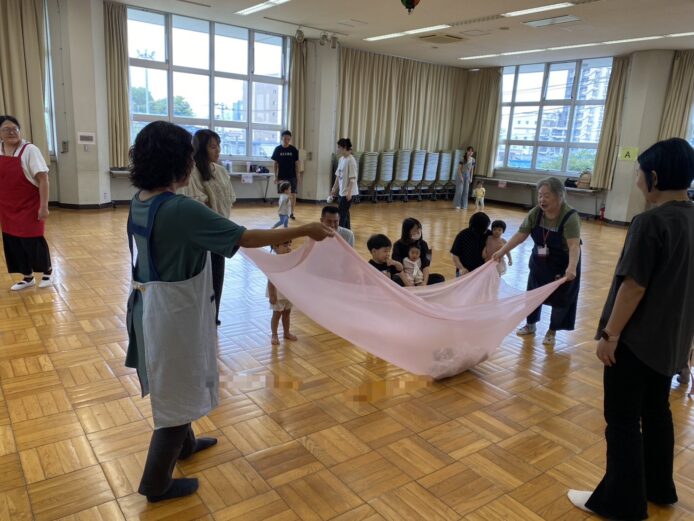 シフォンに新聞紙を入れた袋をのせて、上から下からおおかぜこい♪を歌い1.2.3の合図で袋が飛んでいくのが楽しいですね!